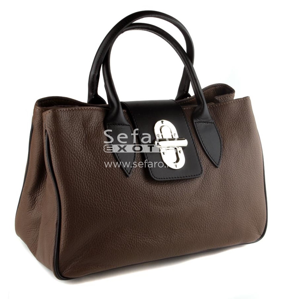 Закрывается на молнию сверху, дополнительно над молнией фиксируется широкий кожаный хлястик, закрывающийся на декоративную металлическую защелку. Внутри: 2 больших отделения , между ними перегородка с большим карманом на молнии. На боковых стенках - 1 карманна молнии и 2 кармана для мелких предметов. Дополнительно имеется ремешок для ношения сумки на плече, длина 120 см.